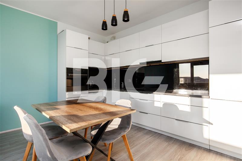 - nowoczesna zabudowa kuchenna na wymiar, wyposażona w piekarnik, płytę indukcyjną, zmywarkę oraz okap podłączony do pionu wentylacyjnego,