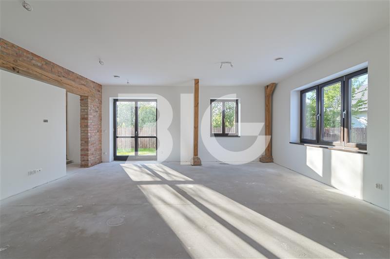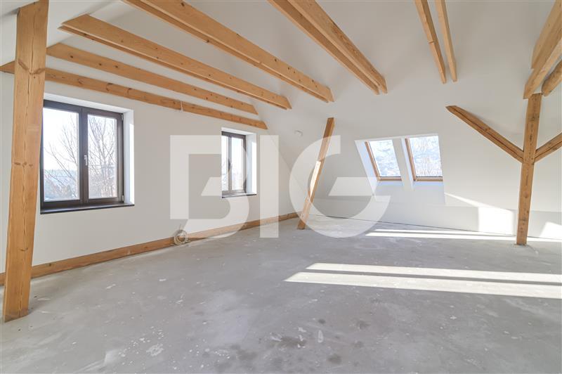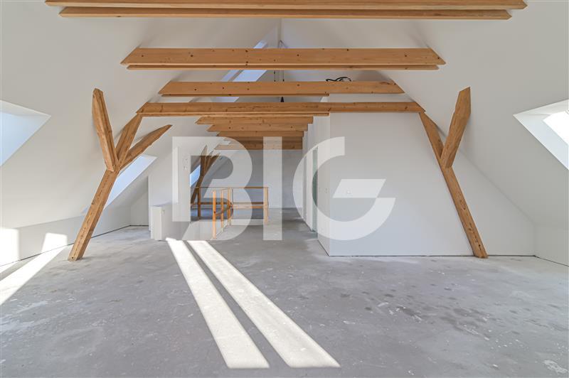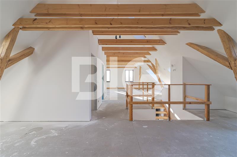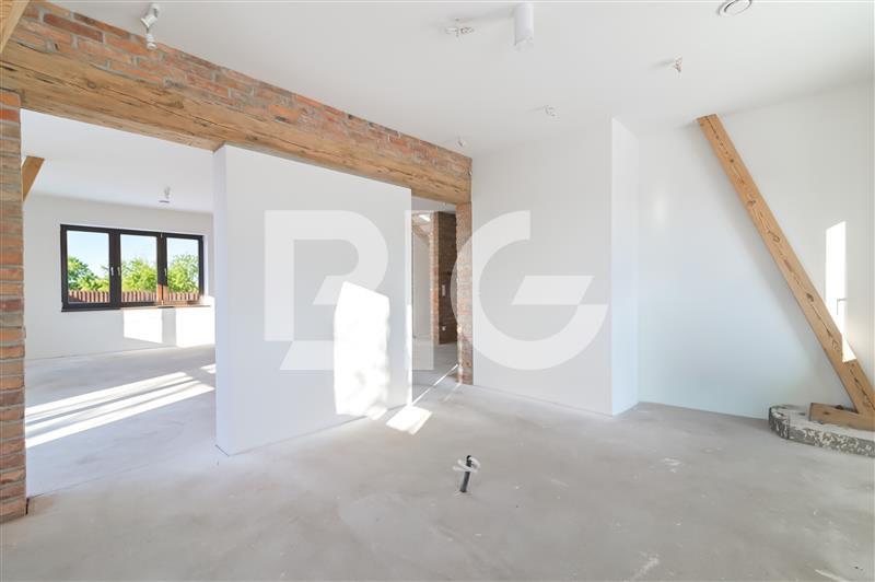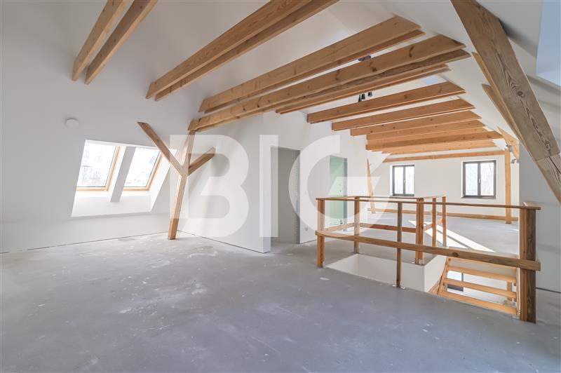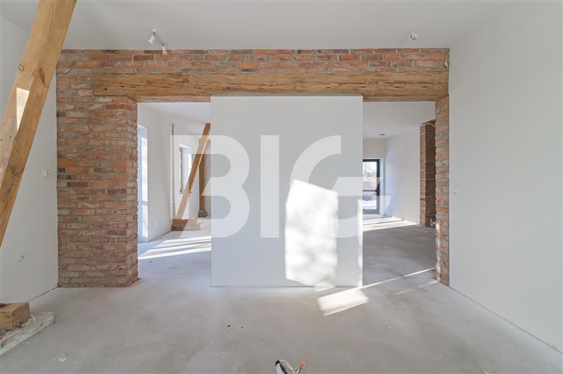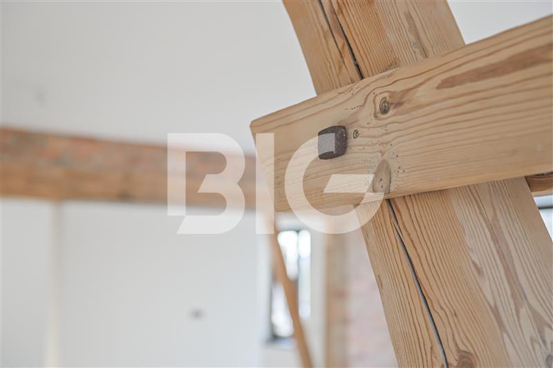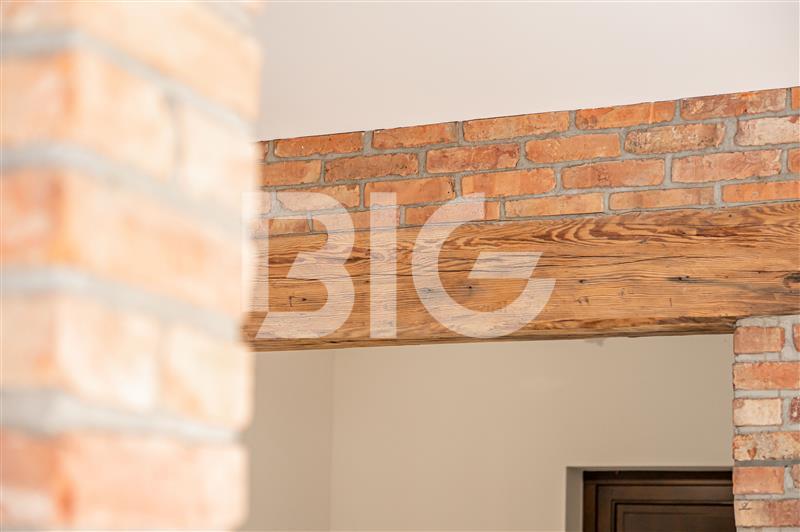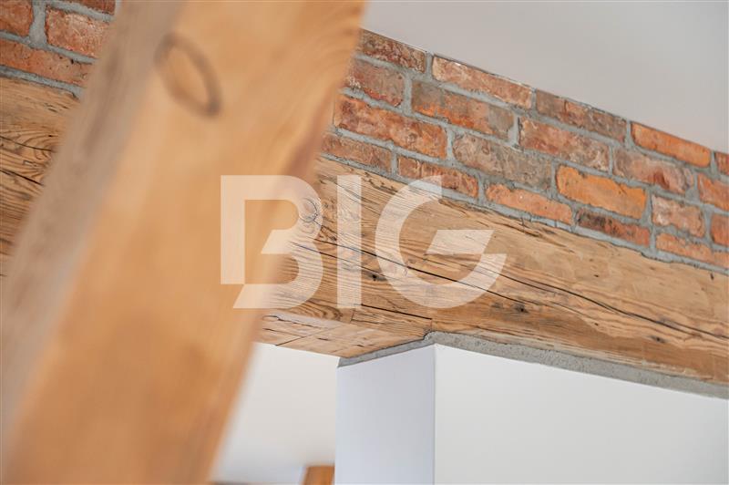Zabytkowym elementem historycznego budynku jest wyjątkowa konstrukcja dachu, która została wyeksponowana we wnętrzu domu.