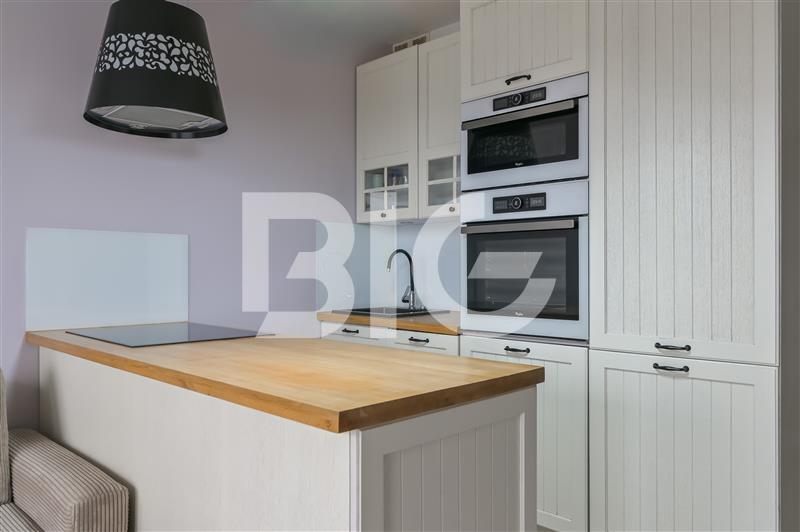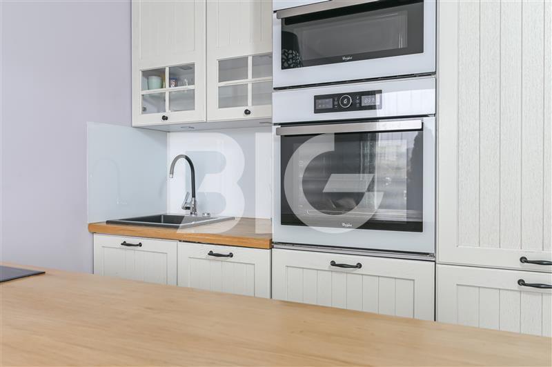 Aneks kuchenny został wyposażony w zabudowę meblową wraz ze sprzętem AGD: lodówka, pralka, zmywarka, kuchenka mikrofalowa, piekarnik, płyta indukcyjna, okap.